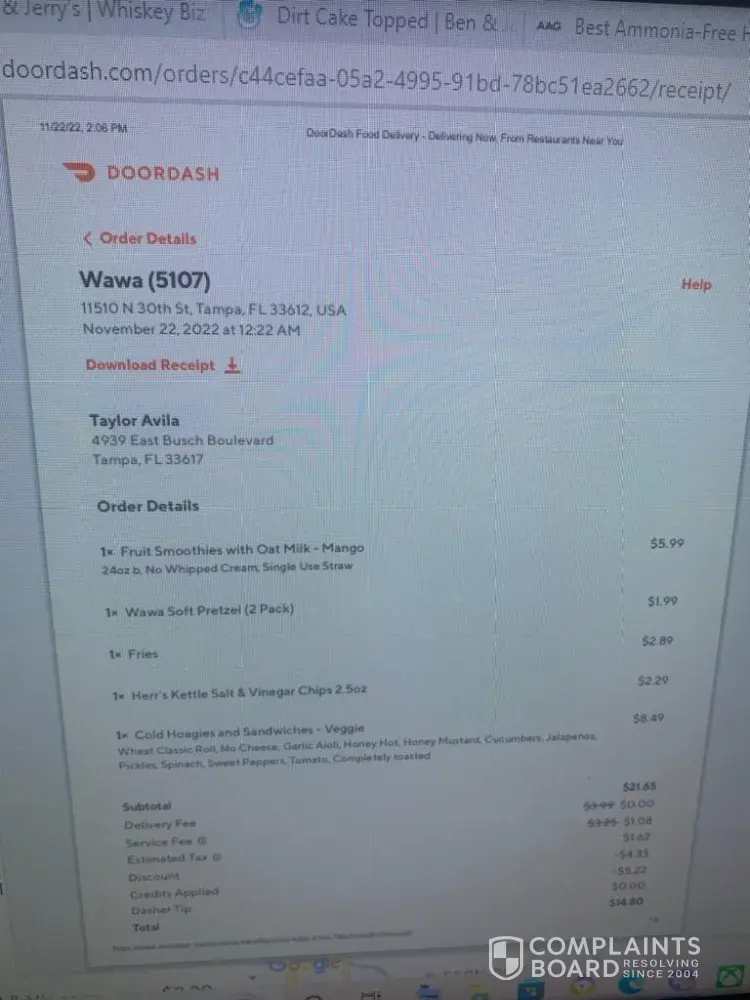 My daughter ordered some food from Wawa on 30th Street in Tampa Florida 11510 N 30th st Tampa Fl 33612. She ordered food and the pretzel had mold on it. My take on this is before you give a customer anything you check it. Basic common sense it doesn't matter if you are shorthanded, backed up, busy or trying to rush. It's unacceptable to send a person molded food. If my daughter didn't look at the pretzel before she gave it to me I might have bitten molded food. This is not the first time I've had terrible service from this store I just never said anything the last time. People are paying their hard earned money for food and they should get everything they ordered like they care. The food is either incorrect, they forget something or mold. There no way to get your money back from Door Dash anymore. Being a manager all my life I know that it starts for management, if you have bad workers you have to train right or re-train them or fire them whatever. Receiving molded food is really over the top. Too be honest if some of your stores don't get it together; just like other stores can go out of business Wawa can for bad customer service and the non caring attitudes. I'm sure if it was their food they would check it would be immaculate.