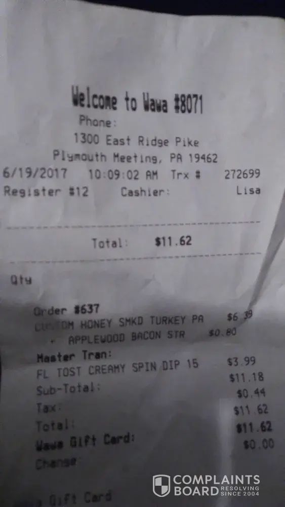 At around 5 pm on 6/17/17 I ordered an italian hoagie from the wawa in paoli, Pennsylvania. The receipt said italian hoagie and matched up with the number on my receipt. When i opened it it was just a roast beef sandwich with lettuce.I don't like roast beef so i didn't eat it. i could not go back and return it because my mom left with the car. i would like my money back please.