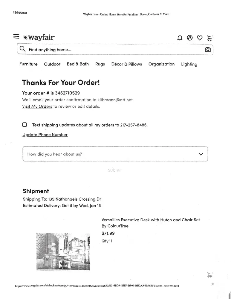 On 12/30/20 I placed an order for a Desk, Chair and Hutch. The price was listed and I agreed to the price. My order and my payment went through and I received confirmation (#[protected]) with a delivery date of 1/13/21. (Please see attached confirmation.) But I did not receive what I ordered. I received a very small package of some type of cloth. When I emailed them initially for a resolution they informed me that there was an error on their part and they could not sell me the items I ordered for that price. The problem is, they already DID sell me those items at that price when they accepted my payment and sent confirmation. I sent a letter to the company (see attached) but was completely ignored. They recently refunded me the original amount of payment but that is not the result I was anticipating.