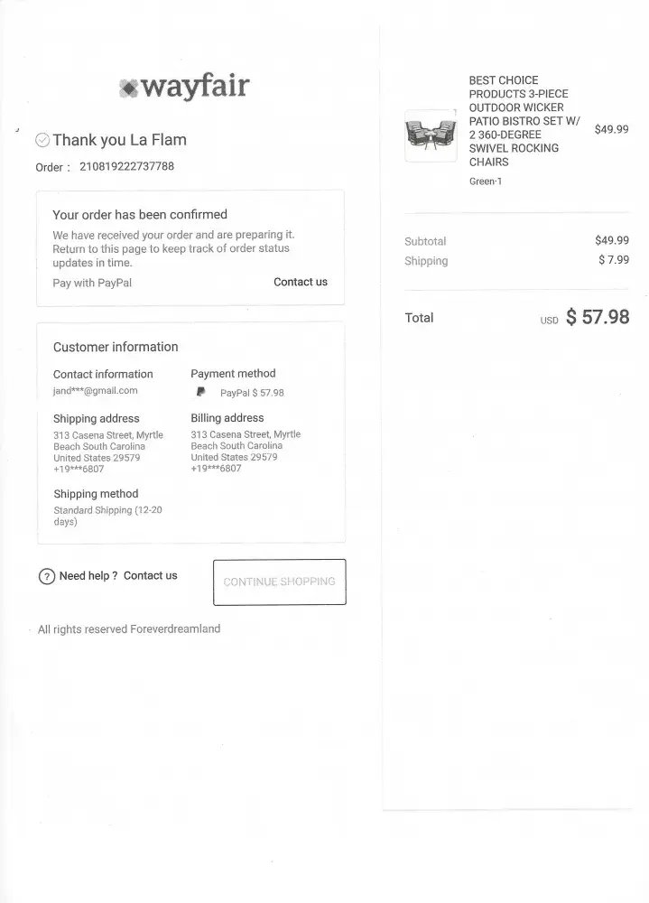 I ordered a patio set from Wayfair many weeks ago. The items never came. Paid through Paypal. The confirmation is below. Order #[protected]. Please look into this for me.
