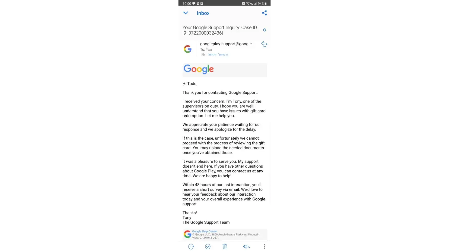 I purchased a $100 Google play gift card on this site. The card that was sold to me was flagged as fraudulent by Google. They are requiring me to submit further proof to redeem it. The proof they want is the original proof of purchase. I notified the seller of this and the seller refuses to or is unable or provide this information. I requested a refund the...