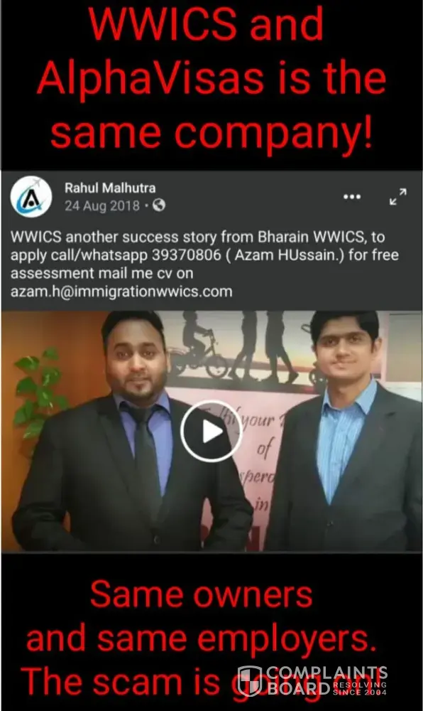 ALPHAVISA is the new name of WWICS bahrain, who close the office and Run Away with my brother money and many more victims (2 years ago) !!! They dont replay on any mails or when we call in india they play and lie us and ask more Money! They just mChange the name and adress of the company and continue with the same Scame and Fraud activity ! Employers also...