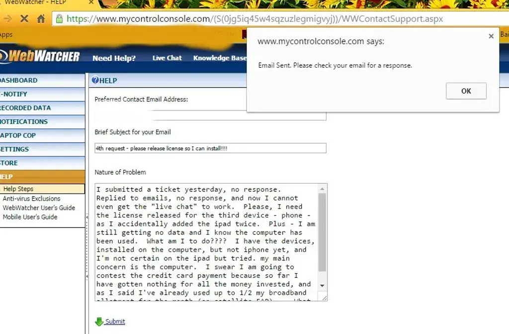 I have been using webwatcher for about 18 months. 2 months ago I paid almost $200 for renewal access to my screenshots, keystrokes etc. 0n sunday, 25 march, the site stopped working. I still have about 132, 000 screen shots left. I can load the page but nothing appears. I am so furious. I have sent several emails to support, which have all been ignored as well as submitting at least 12 tickets requesting assistance. I want a refund or my page restored. I only use this on my home computer. Their phone number has also disappeared off the home page. Is their a more reliable monitoring/ keystroke program on the market?