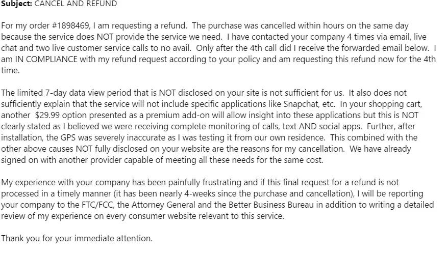 I will be contacting my credit card company to dispute charges. First, it took forever to install the product. Then, it did not appear to be working. Submitted several support tickets, then main website was down, then the live chat didn't work. Spent $129 for nothing basically. I cancelled at first, after realizing the target device did not have cloud backup. Instead, opted for direct PC installation. It does not seem to work at all, as I indicated. It took forever to install and much bandwidth, via support upon initial installation, using over 6 GB over an hour. I think it has been disabled in my minor daughters computer. Also made service ticket - said I would be sent email confirmation, never sent - TWICE! Thank god for screenshots.