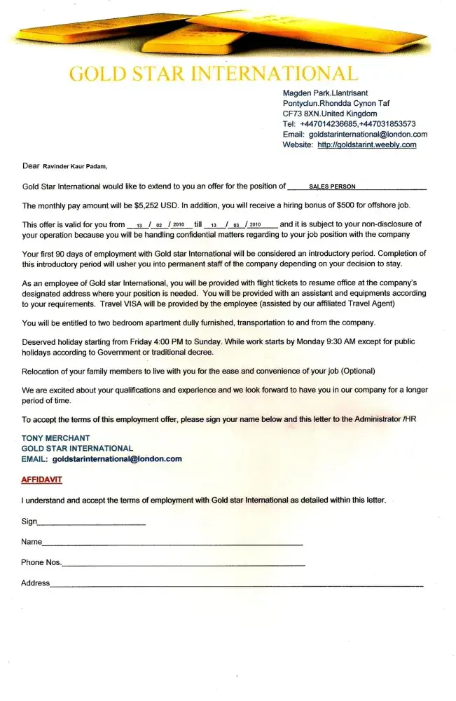 Attached in this mail is an offer letter from GOLD STAR INTERNATIONAL, we advised that you read it properly and understand your job position stated therein before signing to join the company. Double submission of offer letter will not be accepted, hence you are advised to read the attached offer letter, adhere to its instructions and do the needful.