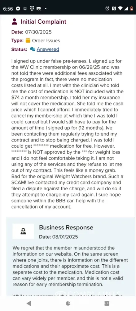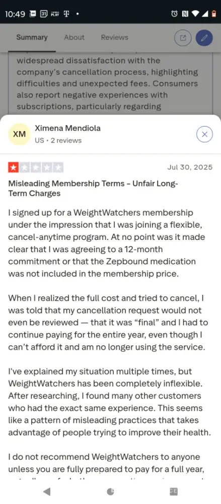 As you can see from multiple reviews on multiple sites, weight watchers intentionally is misrepresenting their intended actions when conning people into providing financially information. Once they have your financial information, they've been over backwards to refuse to release you from what they call a contract. Even while admitting that you misunderstood the terms. Which is a valid reason to terminating contract. It's a total scam.