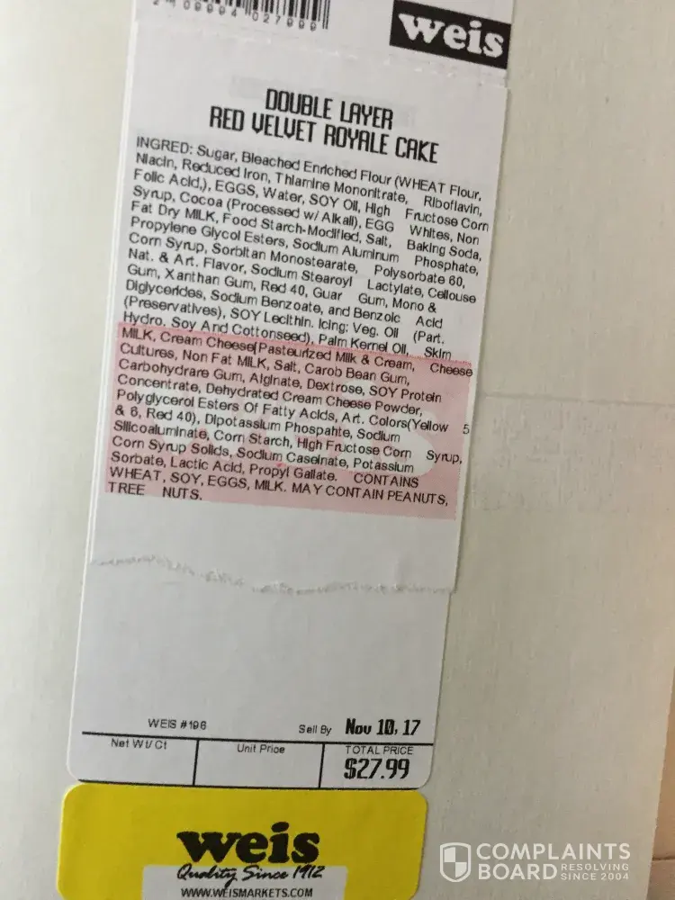 I am usually very pleased with the bakery in my local Weis store in Pennsburg PA. This cake should never have been given to me.