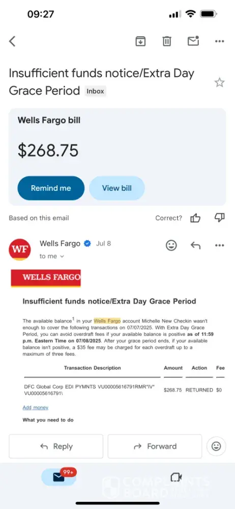 The next day, I got a notification that the wire had not gone through and to contact Wells Fargo. I called Wells Fargo, answered some of their verification questions and was told that the wire would go through this time.