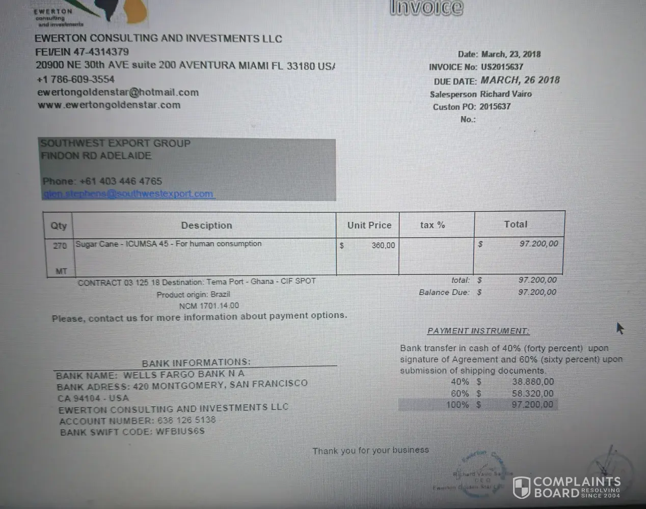 HB Commodities represents in Brazil Ewerton Consulting and informs anyone who may be interested that Ewerton has no contract of sale with the company that is making the complaint. He is a customer of another customer who did not make the full payment according to the INVOICE that was attached. I also inform that the amount paid by the minor was returned through a judicial deposit in Miami and is available to the client. The Contract was canceled due to non-fulfillment of the payment by the buyer and poor this reason the product was not shipped. Any additional information can be requested by contato@hbcommodities.com.br