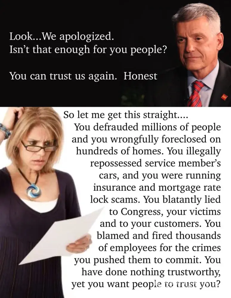All Wells Fargo executive level should be in jail for fraud. Unauthorized accounts, 'mistaken' LOL foreclosures, insurance and services charged for but never asked for. Wells Fargo is a criminal organization.