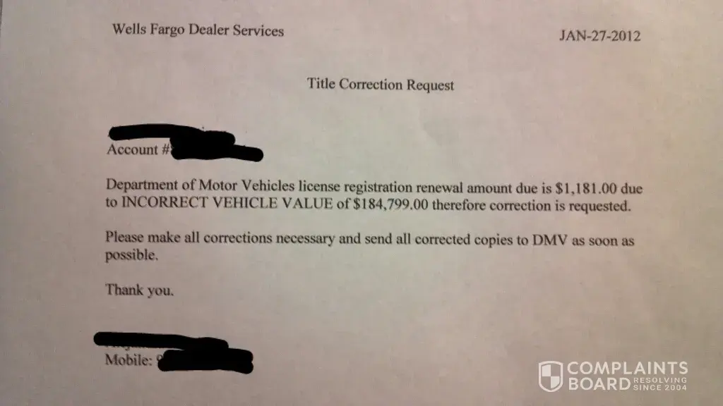 Issue began in early January 2012 when we received our first vehicle registration bill from DMV with amount due of $1, 181.00 by April 8, 2012. We assumed it was an honest error by DMV so we called but we couldn't seem to explain the issue over the phone so we went in the local office. Here is where we were told that the amount due is correct because our vehicle was valued at +$184, 000.00 at time of purchase which is completely incorrect as our paperwork from dealer shows the actual value agreed to pay. We were then instructed by DMV that we had to contact the finance company and have them correct the error. On January 27, 2012 we faxed a "Title Correction Request" letter to Wells Fargo Dealer Services along with dealer contract showing actual vehicle value (per Wells Fargo instructions) and confirmed fax received on their end. April deadline was quickly approaching and we had not received corrected registration or anything indicating action was taken or requesting further information. On March 27, 2012 we went into local DMV office to pay registration but we were asked to pay $1, 181.00 again so we explained our situation again and the clerk came up with a figure of $207.00 which we paid meanwhile this issue was resolved. After our March 27, 2012 DMV visit, we called Wells Fargo and were assured paperwork requested had been sent to DMV since January 30, 2012. We assumed DMV was still processing correction and decided to wait a little longer and hope to see registration in the mail soon. April deadline passed and we still had not received new paid registration for 2012 so we began making calls to DMV until we reached DMV HQ in Sacramento, CA where they claimed nothing had been faxed or received from Wells Fargo regarding our vehicle plate number. DMV HQ suggested that we call Wells Fargo and have them fax documentation again to their direct fax line which we confirmed. We realized we were getting nowhere which is when we began writing names down. On Thursday April 12, 2012 we spoke with Darlene at Wells Fargo and in a condescending tone she exclaimed she had told us numerous times that our request is handled within 3 business days and to call back until then (as if little over 2 months hadn't been enough time). Not satisfied with Darlene's answer we decided to call again same day and spoke with Christina. She then reaffirmed documents had been sent to DMV since January 30, 2012 but she would email their DMV section since they were gone for the day and instruct them to re-fax paperwork to DMV HQ direct fax line (as provided by DMV HQ themselves) first thing Friday morning. On Friday April 13, 2012 at 3:01pm we spoke to Sherry at Wells Fargo and she confirmed fax had been sent to DMV HQ. We called DMV HQ and spoke with Marie and she said they had been waiting all day for something from Wells Fargo and again nothing had been received. We then decided to call Wells Fargo and figure what the issue was behind the faxes not going thru while simultaneously having both entities on the phone. Paul from Wells Fargo answered our call at 3:30pm and Marie from DMV HQ confirmed to Paul that nothing had been received from them and asked Paul to repeat the address documents were sent to which Marie stated was incorrect and then proceeded to give Paul the correct mailing address along with the direct fax number which Paul confirmed that he had made a note of it but sounded distracted as he simply answered everything Marie said with a cynical "yeah, I got it" as to get done with the phone call to get ready to go home for the day or something like that. This would have been the last of the phone calls to resolve the issue of documentation not being received by DMV HQ but because of Paul's unprofessionalism we wanted to make sure the correct address and fax number for DMV HQ was properly noted. So we called back Wells Fargo at 3:50pm and Chris answered and again we had to explain the entire story to him so to avoid further frustration we asked to speak with their manager/supervisor, after a brief hold Tamika picked up the phone call and identified herself as the Supervisor so we continued to explained the issue once again and we expressed we just wanted to make sure that Paul had noted the correct information for DMV HQ but Tamika stated that there weren't any notes made on our file so far regarding any requests of any type for them to re-fax the documentation requested by DMV HQ and repeated the same incorrect address Paul had stated initially. We then gave Tamika the correct address and had her repeat it back to us to verify that she had actually written it down this time. We also expressed to Tamika that this entire issue has been handled completely unprofessionally by them as we are having to baby sit every step to resolve this issue when we feel they should be the ones who should be proactively trying to resolve this issue since they were the ones who valued our vehicle incorrectly. We called DMV HQ on May 8, 2012 at 9:40am and spoke to Bobbi but unfortunately Marie was on vacation but had not seen any action taken on our vehicle registration so she sent us a temporary permit until Marie got back from vacation. We haven't bothered calling Wells Fargo back until we confirm with Marie at DMV HQ first but we dread that nothing has been received from Wells Fargo and will not know how else to get Wells Fargo to cooperate in resolving this longing issue.