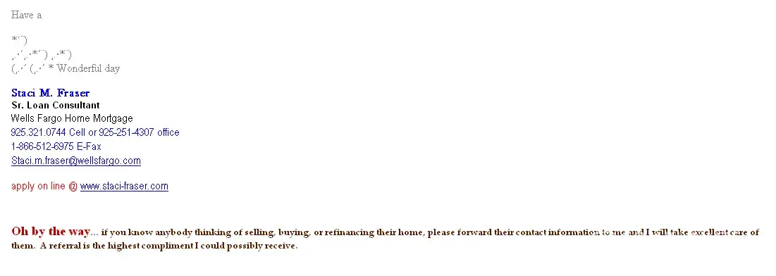 We applied for a loan pre-approval in the end of September 2010, now it's mid-February 2011 and nothing is done. A few times she told us that it's finished, and she's sending a letter. Never did (probably, not literate enough to write it). Also (probably didn't like our names) she asked us to produce VISAS! Given, the required documentation for residents don't include any "visas" and we have none (GC holders from Canada, never needed visas). She also wouldn't answer her email/phone for over a month every time (her last explanation she wasn't in the office) and is not able to answer questions about the loan and problems about it. I've attached her email signature that looks kind of "facebookish".