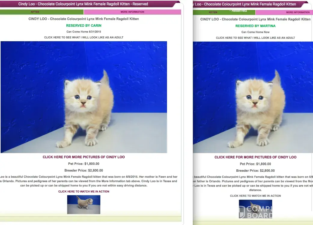 On August 28th, 2015 Leah and Jessica of Love Ragdolls and Ellegant Ragdolls scammed us too. Purchased a kitten named Cindy Loo(photo attached) On hour before I was to pick up our purchased shipped and in air flight, kitten Cindy Loo at Boston, Logan Airport I just happened to text Leah about correct kitten food. Leah said kitten, being shipped from Texas, was not on the plane--not on the plane! Nice to let me know. Imagine my children and I did show up as planned at airport and find no promised kitten. I demanded that I receive vet report that documented Cindy Loo's injury...I was told an injured foot that required antibiotics. No dice. I would not settle for anything less than an official vet report, speak to this/their Vet before we move forward. The entire situation smelled of lies. A month later with not one response from either the elusive Leah or Jessica I find the kitten, our still paid for and contracted for Cindy Loo for sale again. What! That's a feloney. I had a signed contract for C.L., paid for her $1600 plus her shipping $275 and no vet report on how my kitten was injured. No kitten either. Really. Well I called the department of Consumer Affairs and filed a report in South Carolina as well as in Texas, their respective local Television stations, reported crime to their local District Attorney's, filed complaints with TICA(who incidentally have 100's of complaints against Love Ragdolls and Elegant Ragdolls) oh and the Banks involved. These two, Leah and Jessica, only care about one thing $$$$$$$. So they haphazardly breed sick cats that yield cute sick kittens. Fraud and Felany. Photos of Cindy Loo attached -- same kitten sold twice while I owned her. They never did supply any injury report because they lied and lied repeatedly. When it became apparent that I would not have Cindy Loo shipped without the vet report they stopped communication. Disgusting. I highly recommend following the same assault path I have against these two unscrupulous charlatans. I won.