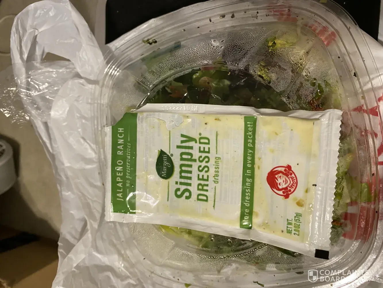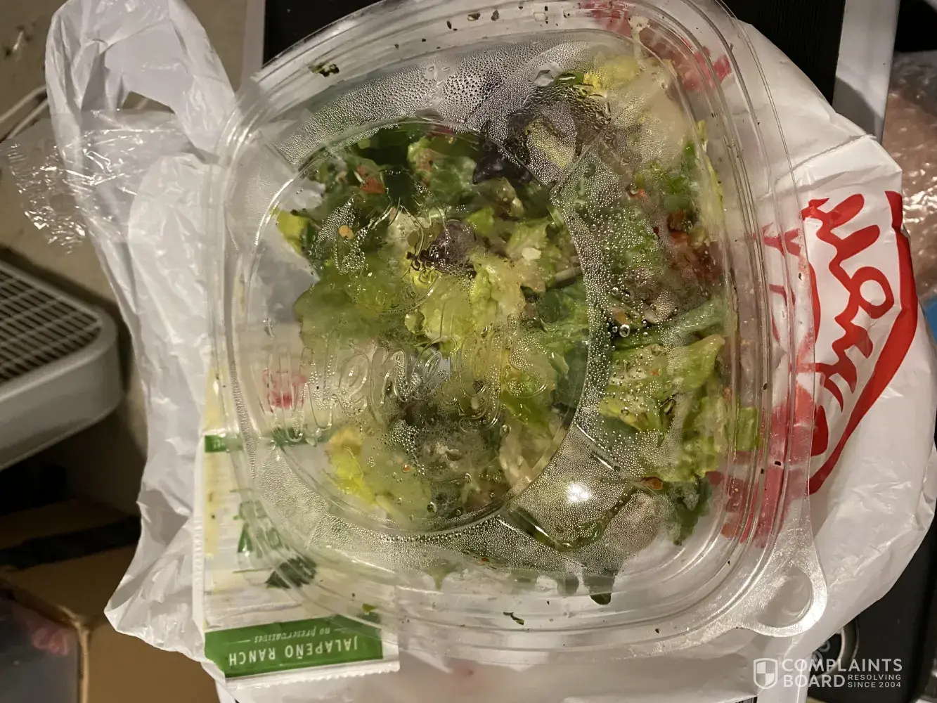 I ordered a jalapeño popper salad with jalapeño ranch dressing. The salad I ordered was brown and wilted. I tried to complain on the website and it does not work. An error message kept popping up. I did not get a receipt; however, I took pictures.