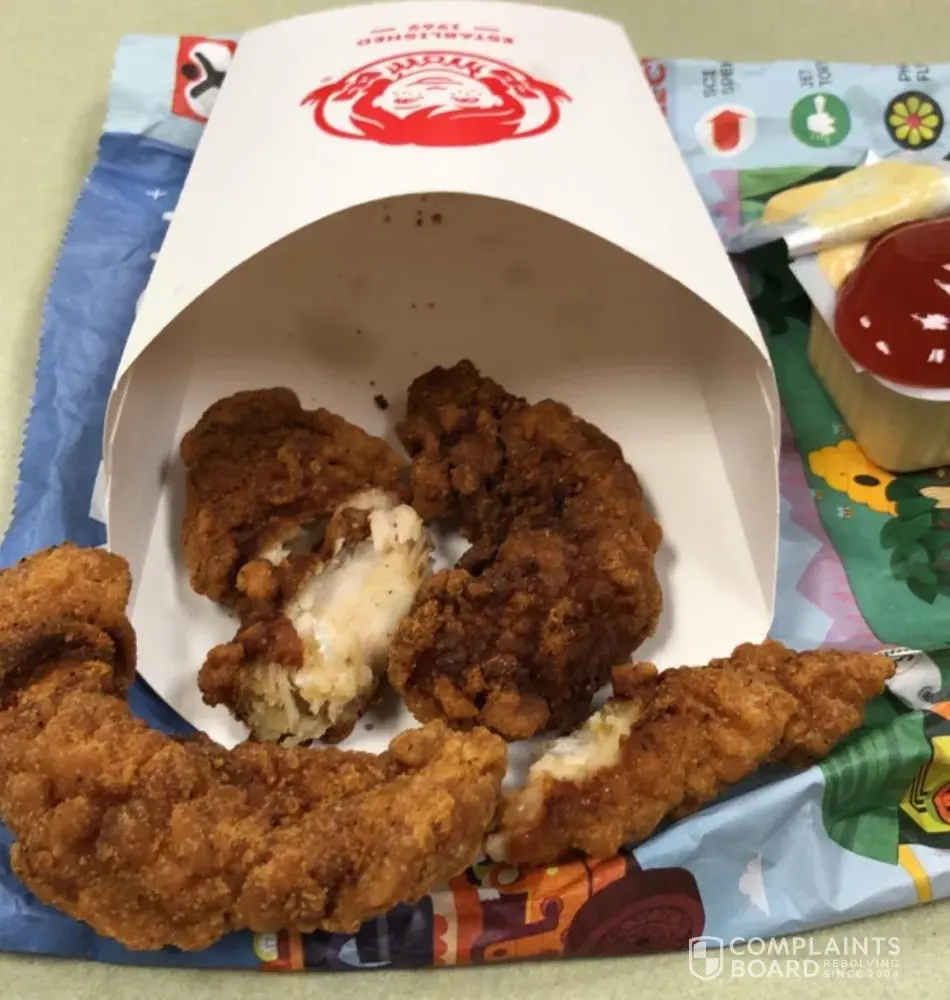 04/18/19 I went through the Wendy's #[protected] drive through at 12:27pm and ordered a med son baconator combo, 4 pc chicken tenders and a childs nugget meal for my co-workers and I. My receipt number is #3084. When I returned to work (which is approximately 3 minutes from Wendys) I was in shock when I pulled our food out of the bag and seen the condition it was in. The chicken in the 4 pc. tenders and chicken nugget meal were so dried out, burnt and hard that they could not be eaten. The nuggets were thrown in the garbage before I could get a picture but I do have a picture of the tenders attached. In addition, this was supposed to be a 4 pc tender and it was actually 3 and 1 was torn apart to make 2. Needless to say, 2 of my coworkers went without lunch today because of the poor condition of the food. I have attached a picture of the tenders and also a copy of my receipt. I would like to be refunded for the tenders and the nugget meal if possible. My email address is [protected]@gmail.com.