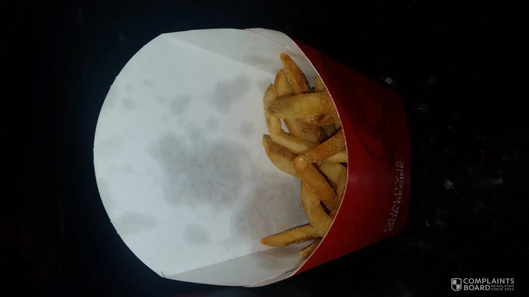 I ordered fries. NOT A VALUE FRY. TGEY GAVE ME IT IN A BIG FRY CUP BUT THE QUANTITY OF A VALUE FRY. The other fries were well made. This to me is unacceptable and not good for business. They took advantage of my money. This is a waate of money and time. This is also not the first time either. They somwtimes mess up my order too! The fries had not even been touches until I picked up the fries. This is why i have a complaint.