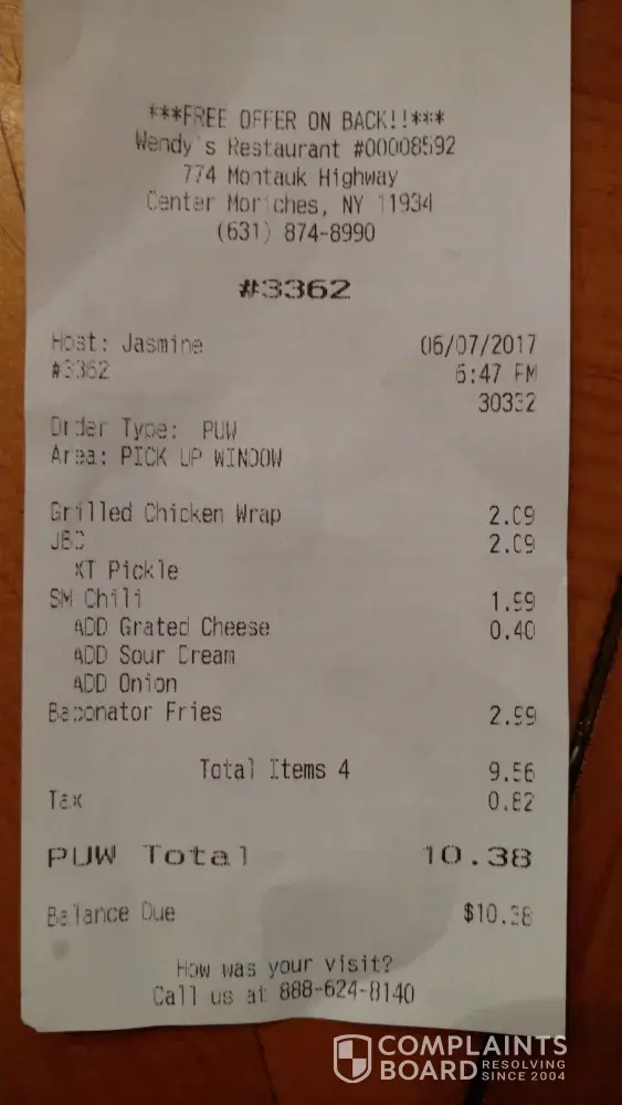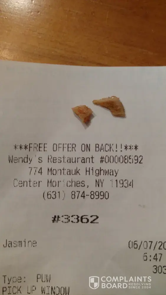 On Wednesday June 7th 2017 at 6:47 p.m. I went to Wendy's restaurant #[protected] at 774 Montauk Highway Center Moriches New York 11934..