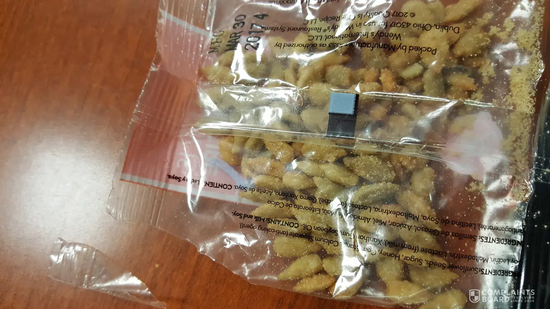 Today I tried the new Strawberry Mango chicken salad. The salad was not as expected but it killed the hunger. One of the condiments to the salad are Honey Roasted sunflower seeds; i decided to save them for a snack later. I got to work and went to open the package and there was a strip of blue plastic in the actual package. I am happy I saw the plastic before I started eating because there are not too many place I can spit at work. Also I decided to look at the expiration date and the contents are also expired. The expiration date is March 30th 2017, today's date is June 8th 2017.