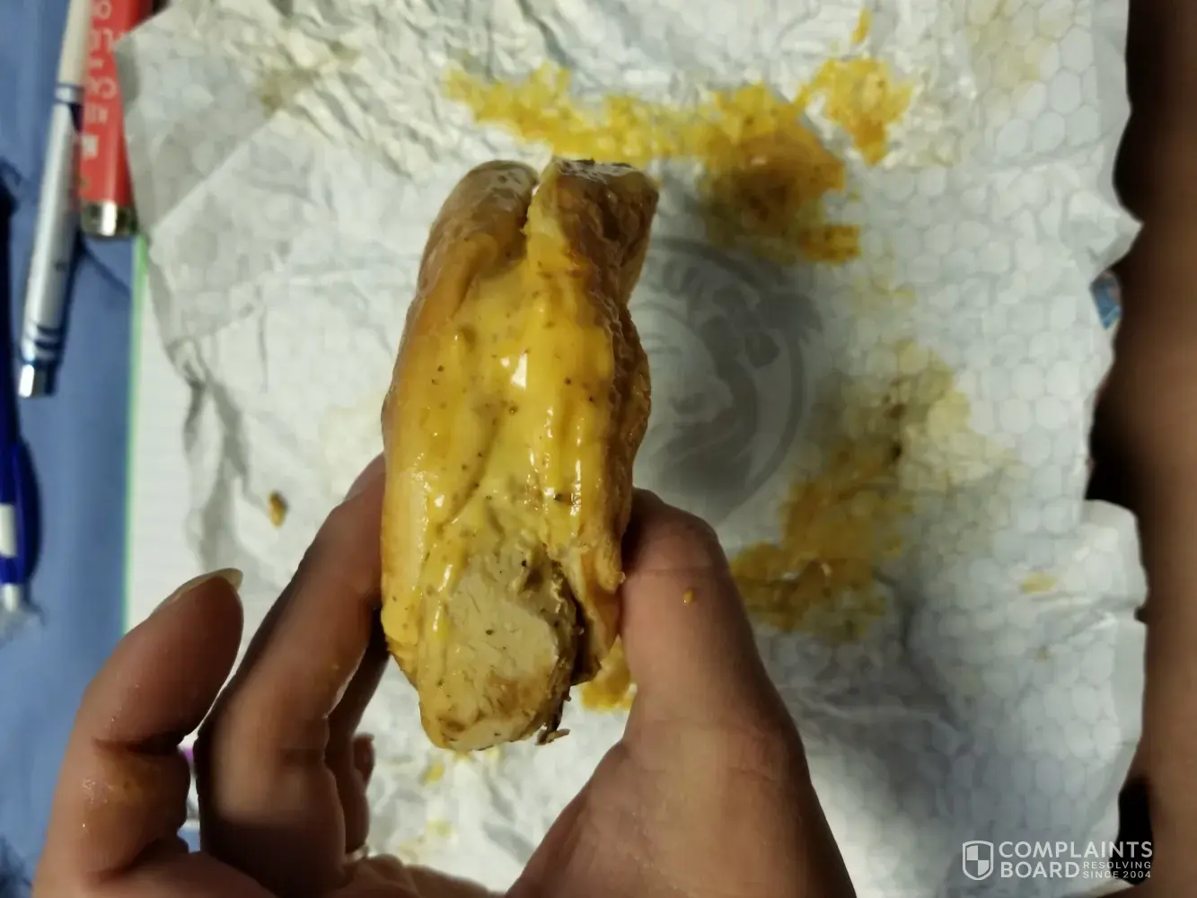 My 1 year old daughter was eating a chicken nugget and i started to hear her choking, i stuck my finger in her throat and felt something sharp! It was a [censor]ing bone! How do yall manage to have bones in chicken nuggets knowing small children eat them! This is [censor] i want to kno what i need to do about this! If something more serious would have happened id sue the [censor] out of wendys!