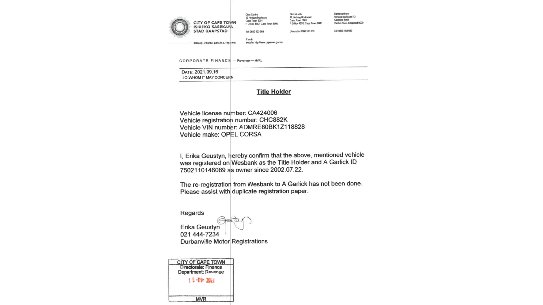 Since October 2021 I have been trying (via email and phone calls) to obtain the RC1 Natis documents for a vehicle that has been fully paid since 2010. The transfer of ownership and RC1 papers were never done. I have submitted all the required forms (via email) at least 6 times now and every time the communication stops and I have to submit again. Can somebody please help? Alison +[protected]