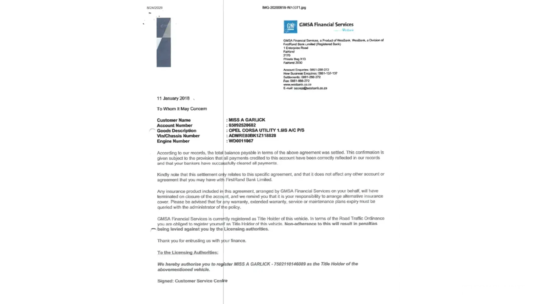 WesBank Requesting border letter for financed vehicle.