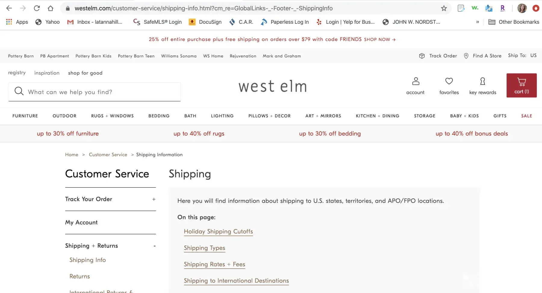 March 14, 2020 I tried to place an order on a sofa for our daughter because their website advertised 25% of your whole purchase and free shipping over $79 order when you entered the code "FRIENDS". I searched their website to see if any restrictions applied and the link only took me to their shopping page and no where could I find any restrictions.