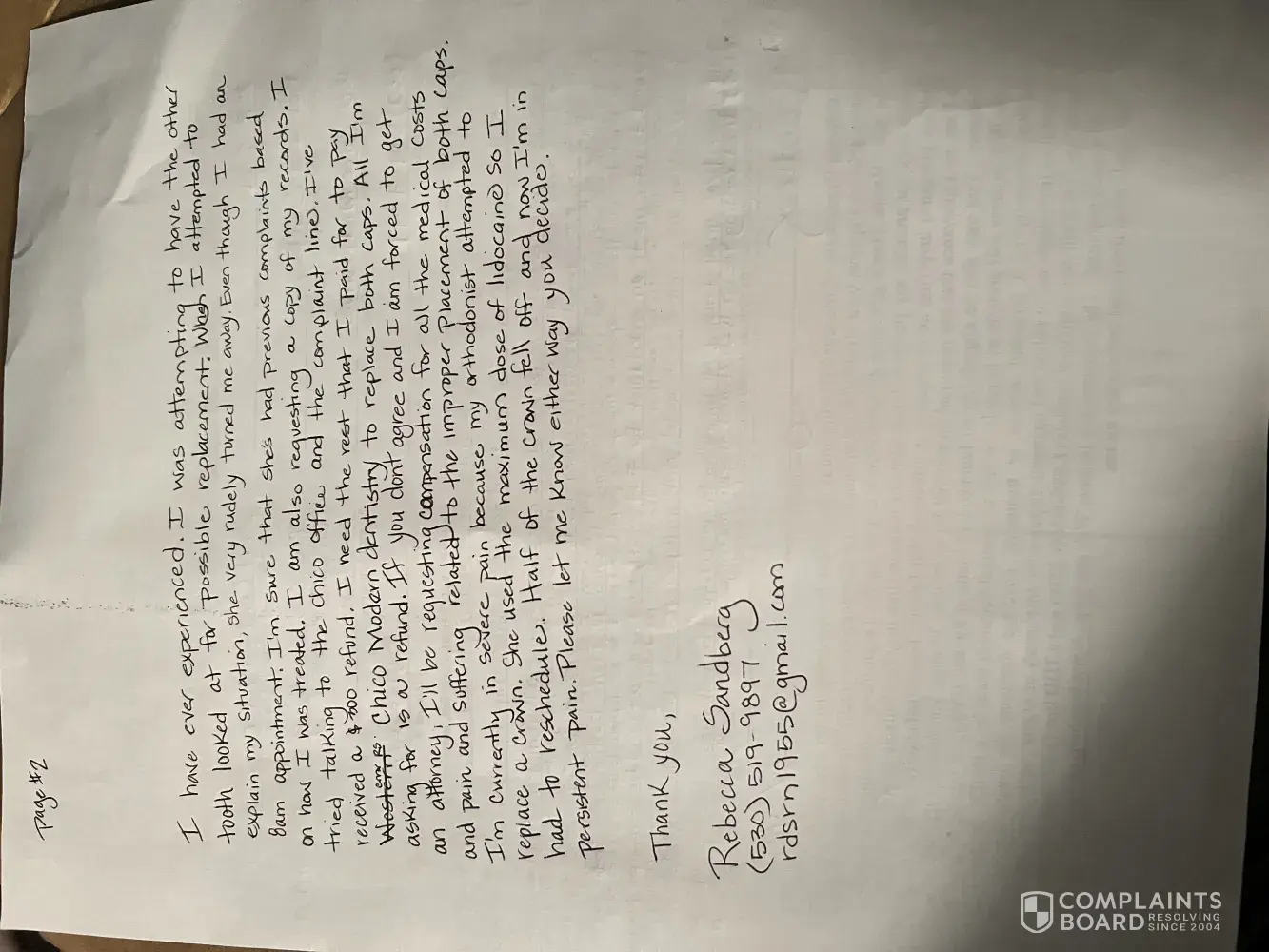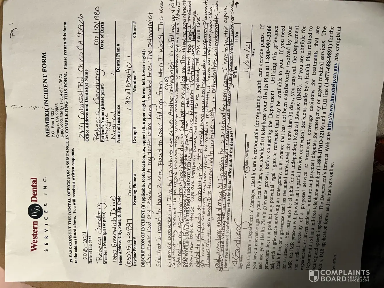 An orthodontist at Western Dental even said that they would replace #19 at no charge due to improper placement. At my next appointment Chico Western Dental was closed related to Covid. 2 appointments after that, my family had possible symptoms. I was turned away twice after that. 11/29/21 8am the girl in charge was extremely rude and refused service when I wanted an exam for possible cap replacement. I've endured a lot pain and financial hardship related to this. All I'm asking for is a refund of both caps so that I can get them replaced. X-rays on both crowns show a gap. I've had problems with #19 ever since. Please let me know if you need a copy of the x-rays. I'm requesting a complete copy of my chart.