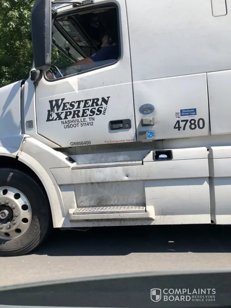 My husband and I just got ran completely off of the road going 50mph by a Western Express driver and I am 9 months pregnant. He did a lane change from the left-to-right lane with no signal and we had no choice but to go into the grass. He didn't even realize until we pulled up next to him and he had his face in his cellphone, we asked him to roll his window down and all he said was "what?"