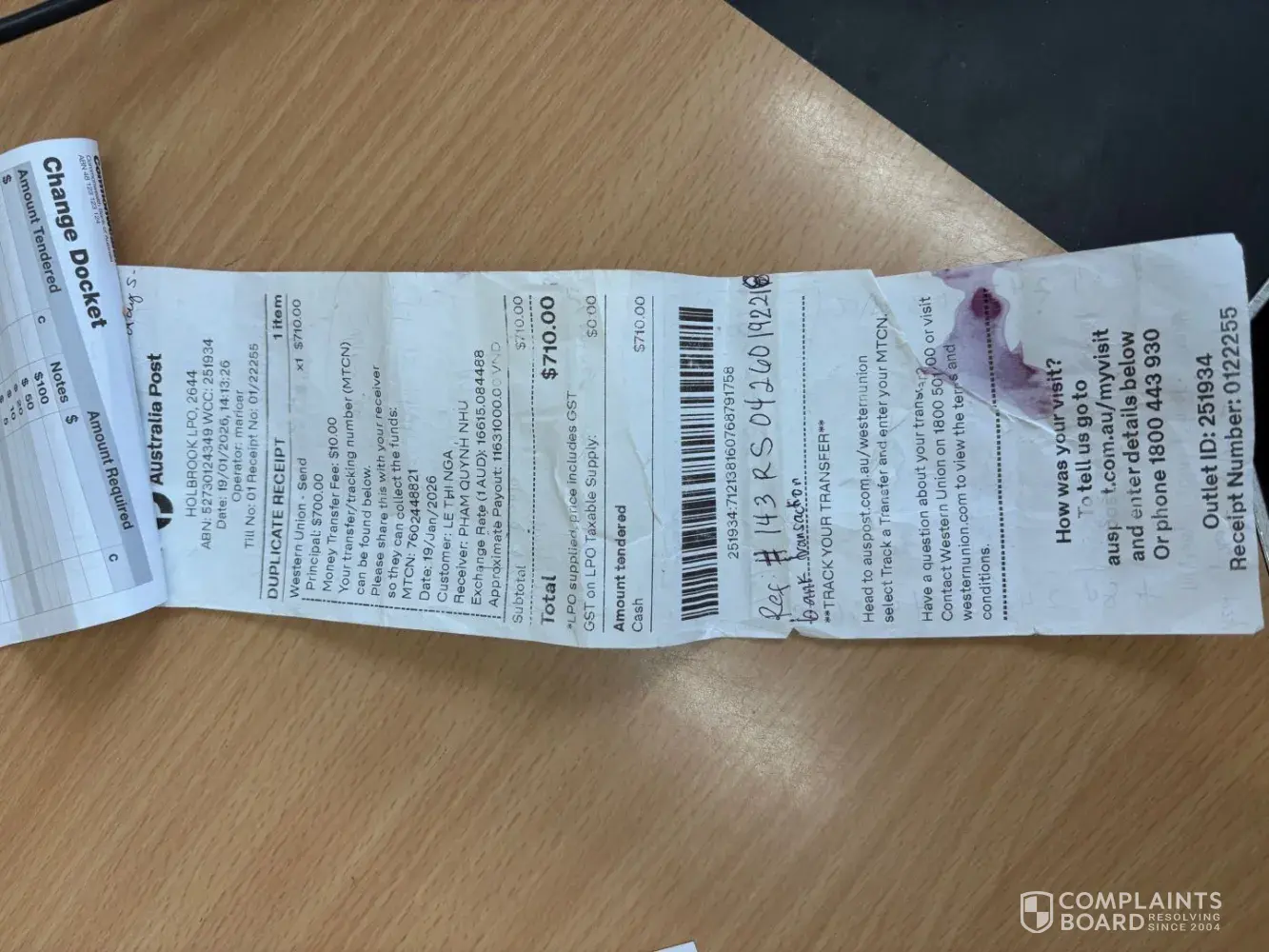 I used Western Union on 19/01/2026 to send money to Vietnam but by mistakes i accidentally gave them a wrong account number so straightaway told them staff ring (Auspost) them I ring them, but they told me its already transferred i have to wait for 7 days for the bank replied been ringing western union every day since the transaction happened spoke to...
