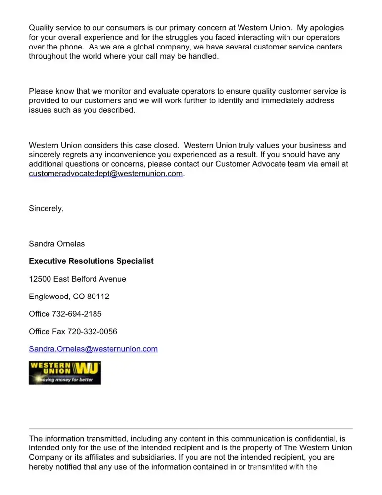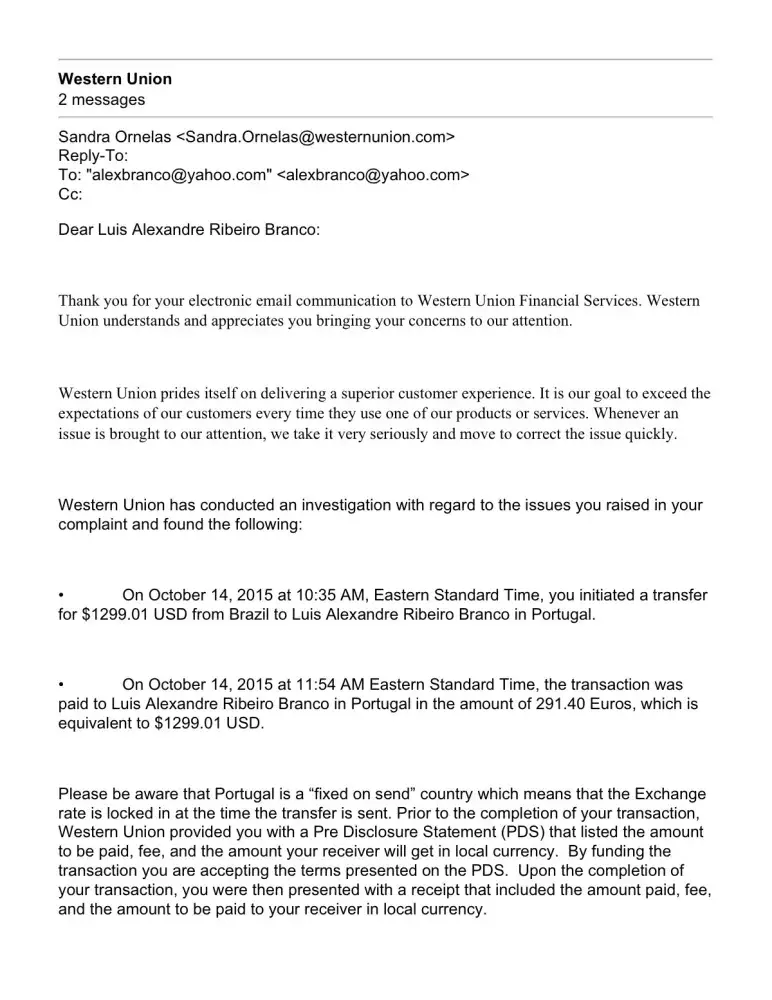 Crazy! @WesternUnion exchange rate, according to their message to me: $1299.01 USD is equivalent to €291.40 Euros. This is the reason which they presented to me when I complained that they made a mistake with my transaction. Western Union message below: On October 14, 2015 at 11:54 AM Eastern Standard Time, the transaction was paid to Luis Alexandre Ribeiro Branco in Portugal in the amount of 291.40 Euros, which is equivalent to $1299.01 USD. Please be aware that Portugal is a “fixed on send” country which means that the Exchange rate is locked in at the time the transfer is sent. Prior to the completion of your transaction, Western Union provided you with a Pre Disclosure Statement (PDS) that listed the amount to be paid, fee, and the amount your receiver will get in local currency. By funding the transaction you are accepting the terms presented on the PDS. Upon the completion of your transaction, you were then presented with a receipt that included the amount paid, fee, and the amount to be paid to your receiver in local currency. Quality service to our consumers is our primary concern at Western Union. My apologies for your overall experience and for the struggles you faced interacting with our operators over the phone. As we are a global company, we have several customer service centers throughout the world where your call may be handled. Please know that we monitor and evaluate operators to ensure quality customer service is provided to our customers and we will work further to identify and immediately address issues such as you described. Western Union considers this case closed. Western Union truly values your business and sincerely regrets any inconvenience you experienced as a result. If you should have any additional questions or concerns, please contact our Customer Advocate team via email at [protected]@westernunion.com. Sincerely, Sandra Ornelas Executive Resolutions Specialist