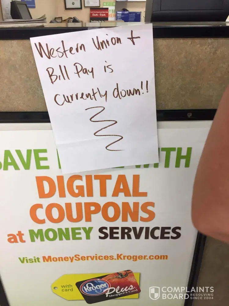 I'm a regular Western Union customer at Kroger in Cleveland, MS. I am filing a complaint because there are numerous of times I would try to send or receive money from Western Union at that Kroger Store and this one lady, Alexis, ALWAYS say that it is down when I know it is not simply because whenever she is working it is down, but when the others that work there, I have no problem and it's never down. This is an ongoing cycle when she works. She brings bad business upon your brand and store and I am furious with not only her but the store that allows her to do this! I have even taken a picture of the handwritten sign that is always posted up saying it'a down. Something needs to happen IMMEDIATELY!