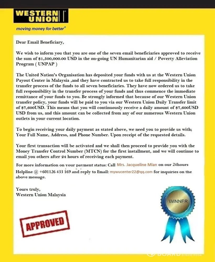 I also recently received an email from a Helen Gribbson which appeared to be from Western Union of malaysia. The email stated i am one of seven beneficiaries of UN Humanitarian aid/poverty alleviation program(UNPAP) 2016. I was curious and have spoken with a women who calls herself Mrs Helen Kuan claiming to be ( payout officer)a few times and she has assured me this is not a scam but a legitimate program. I would like to know if this can be investigated as soon as possible to allow people like myself be aware if this is fraud or not. As some of the emails are coming in from western union address it is hard to tell. Thankyou.