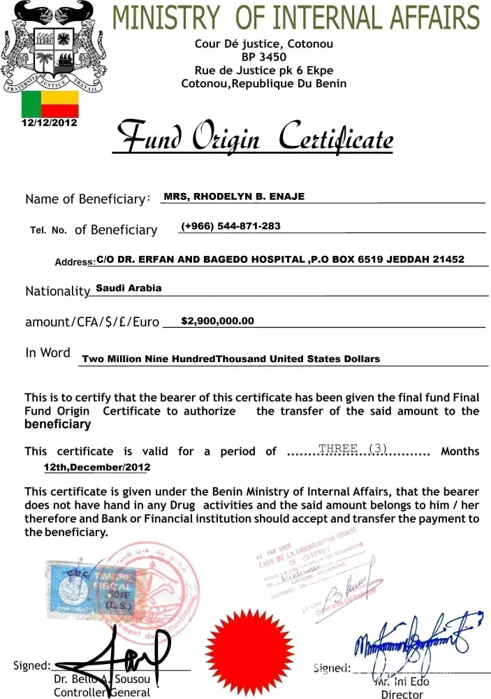 I also receiving emails because of my situation "money needed" for my sick brother I send a big amount knowing is true first small amount the I send twice because of the certifate of non resident and IMF monetary fund certificate I'm so stupid I believe maybe because I needed the money, when they asked for the 3rd time I didn't believe anymore cause it weird shipping from Benin to Asia country will took one day it's impossible and the amount they are asking is so big for a shipping of ATM card.. I just cry and feel stupid for myself they used sister cause they are Christians if I talked bad like are you a son of demon cause I don't have money but keep on asking for certificate fee then he said im not a Christian because the way I talked to them.. why people do this in Benin republic, johannesburg, cotonou, Lagos Nigeria, south Africa, united kingdom, milan etc. mostly they used western union cause it's easy no information needed and western union are not safe cause if fraud or scammer get the money you can't get it back mtcn number cannot be detected.. so money gone, also they uses bank like absa, standard charter, central bank of Nigeria, HSBC, first bank, equity bank Plc, amalgamated bank, courier like FedEx, dhl, ups etc. international courier also the international monetory funds, federal ministry of justice republic of benin, most of the country scammers and frauds are from south Africa, Benin, cotonou, johannesberg, united kindom, milan, Lagos Nigeria, etc