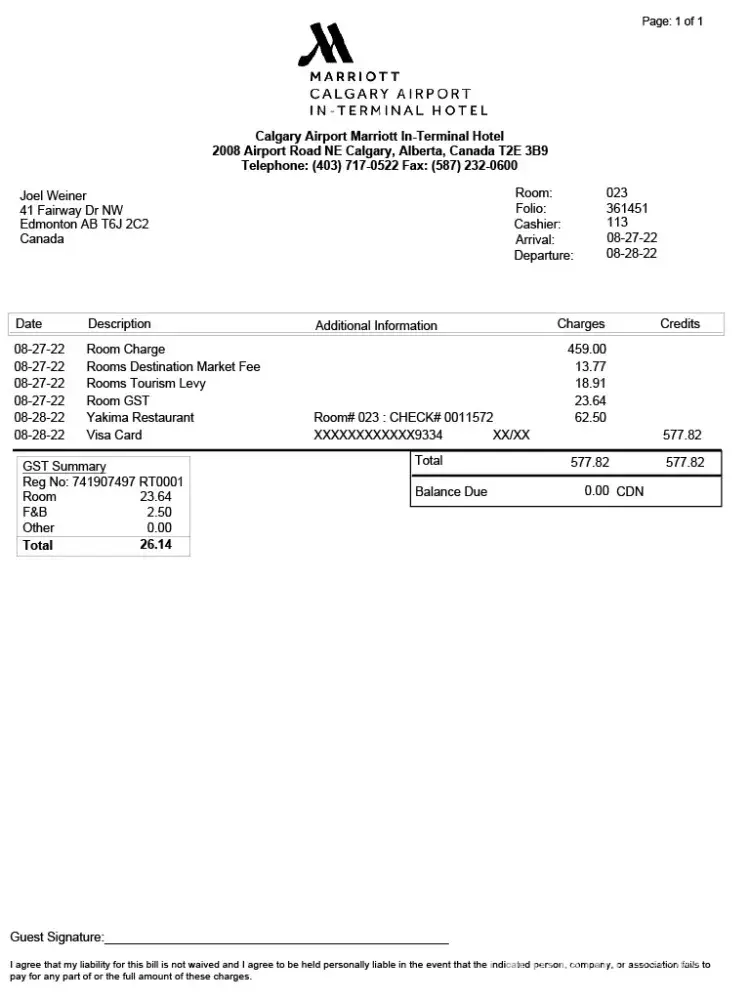 Our flight from Seattle to Calgary was delayed 15 minutes due to “Airport Operationsâ€. When we arrived in Calgary we waited nearly 20 min on the tarmac for a ground crew to connect the jetway. We then had to pass through Canada Customs and transfer terminals for the Calgary to Edmonton flight. As I am over 75 years old I could not run. Nevertheless we arrived at the gate prior to 11pm but the gate had closed 2 minutes previous and they would not reopen. We were told to go to check in to rebook and a supervisor would meet us. No supervisor appeared. We waited 90 min in the checkout line as only 2 desks were open and three additional customer reps were chatting. When I finally complained they opened more desks. We were told the earliest available flight was 3`pm on August 28th. This is a delay of 15 hours. We had purposely left Sacramento on Sept 27 as I had work to finish in Edmonton on Sunday August 28. Due to the late hour we had to stay at the Calgary Airport Hyatt. Our receipt for hotel and breakfast is attached.