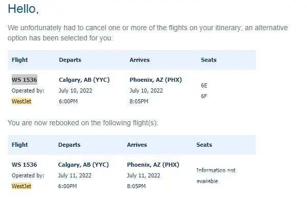 WestJet Airlines Flight Cancellation with a revised schedule now with a stop