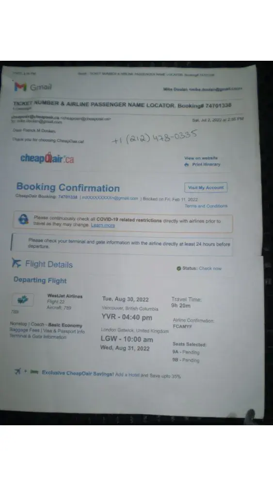 In 2021 my sister (located in White Rock, BC) and myself (located 2 hours from Kelowna in Osoyoos, BC) planned to go on an intensive 12-day self-drive vacation in Scotland to research our heritage. She was to depart from YVR (Vancouver) and I was to depart from YLW (Kelowna). The plan was to simultaneously arrive in YYZ and then travel together from YYZ to GLA (Glasgow, Scotland). To return some 12 days later, also via Westjet.