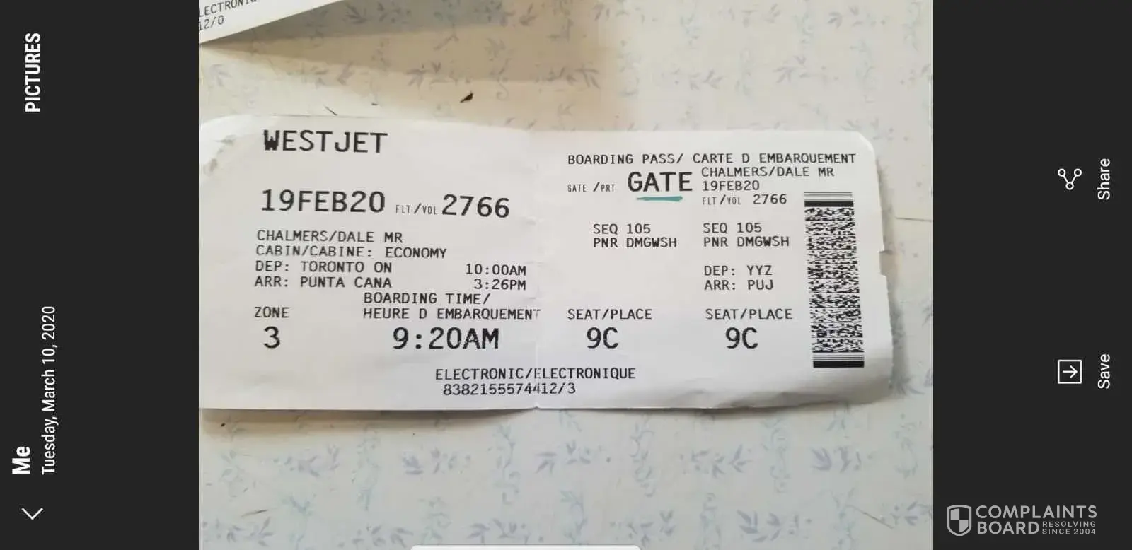 Westjet WS 706 Reservation code: ZBMWDH