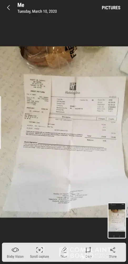 Unfortunately my prearranged ride from Moncton to my home could no longer accommodate me so I had to book a hotel for the night. The hotel room cost me $149.79 plus the cab ride from the airport was another $50.