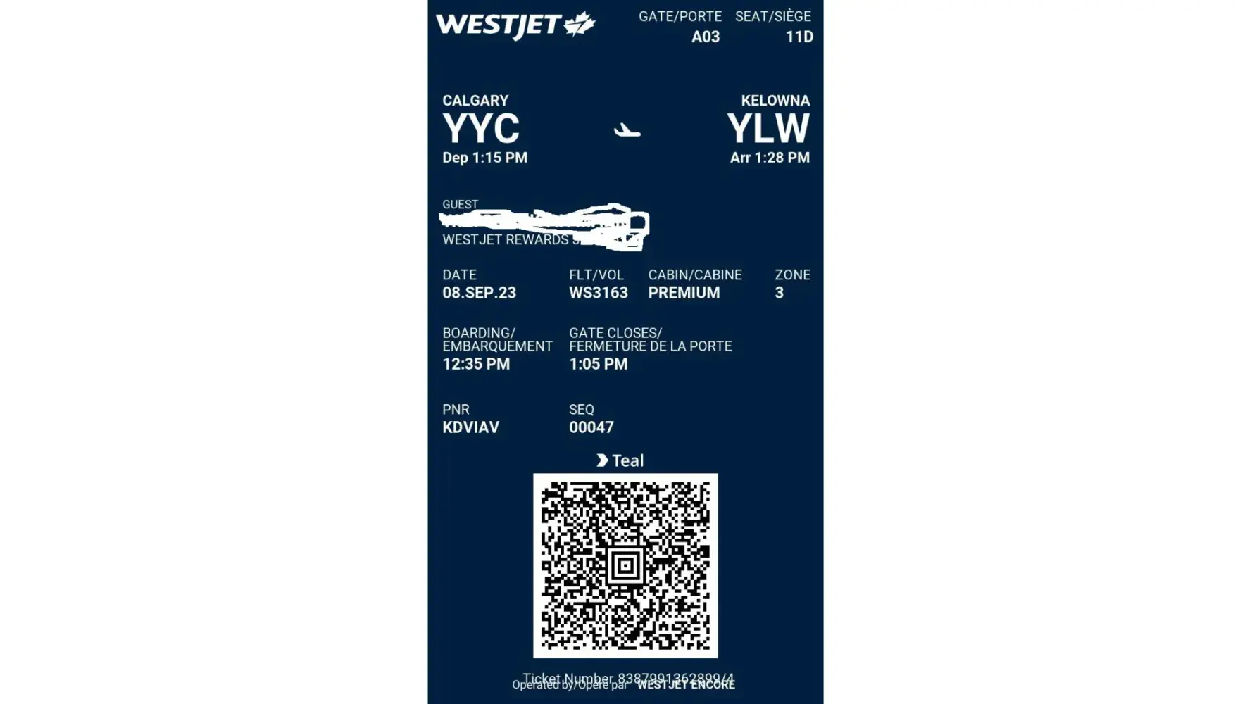 on Flight WS 3310 Sept. 13, 2023 9:10pm to 9:50 pm from Vancouver to Kelowna .