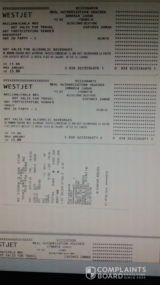 The next day I received an email from WestJet apologizing for the flight delays and a $250.00 WestJet dollars into my account that needs to be used within a year….what a joke! I was provided with some meal vouchers that I still have and of course the hotel voucher provided was useless as there was no time to make use of that. This is a goodwill gesture, not compensation which I feel I am entitled to.