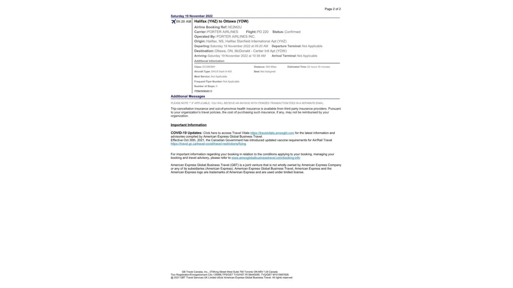 On November 13, 2022 I was scheduled to fly to Halifax (Booking Code BUAGOL). The schedule was changed such that it would have taken 36 hours to travel to Halifax with an overnight stay in Toronto. As this was a business trip and coordination with other members of my team was required, this schedule change was unacceptable and required me to book with another carrier. My travel agent was contacted to make the change and a credit note was issued which has not been reimbursed to my credit card.