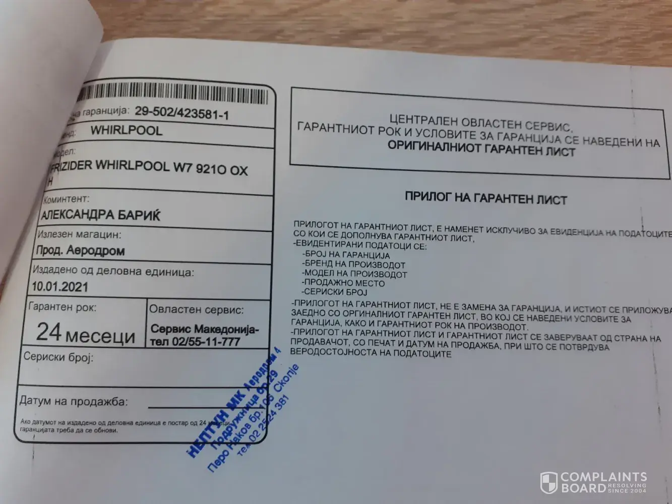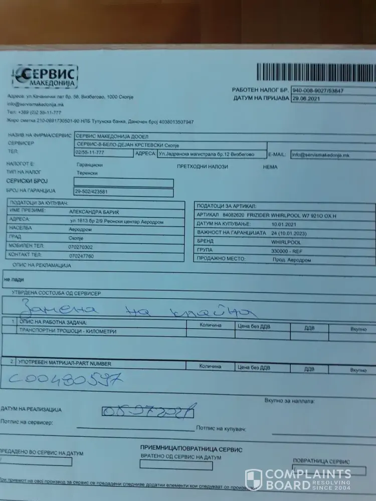 The appliance in question is a refrigerator Whirlpool W79210 OX, bought in Skopje, N. Macedonia (attached is the warranty list). The receipt is also attached (in MKD which equals 550, 00 EUR in a country with average salary of less than 450, 00 EUR).
