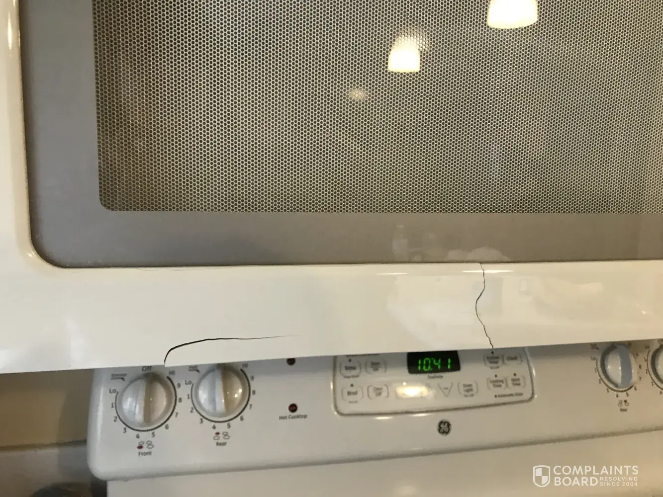The door of our microwave is cracked in two places, one crack goes all the way through the plastic. The microwave is an over the range microwave. I worry that pieces will fall off and damage the range below. Also, the door is biscuit colored and difficult to find. We had this same problem with our last whirlpool microwave, and replaced it; hoping that the company had corrected this design flaw; but this diir is more damaged than our old one.