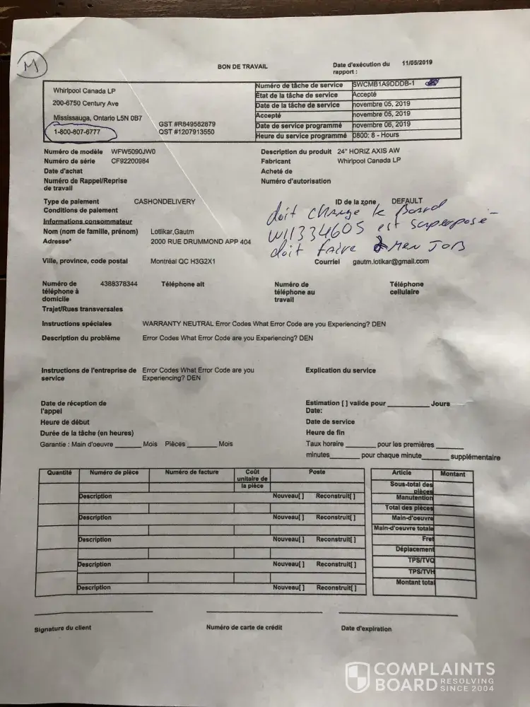 - June 19, 2019. Whirlpool sent an invoice for "Labour", $146.89 CAD, presumably for 'customer training' which is insulting and outrageous. We can, and did, read and follow instructions - every combination - before calling Tech Support.