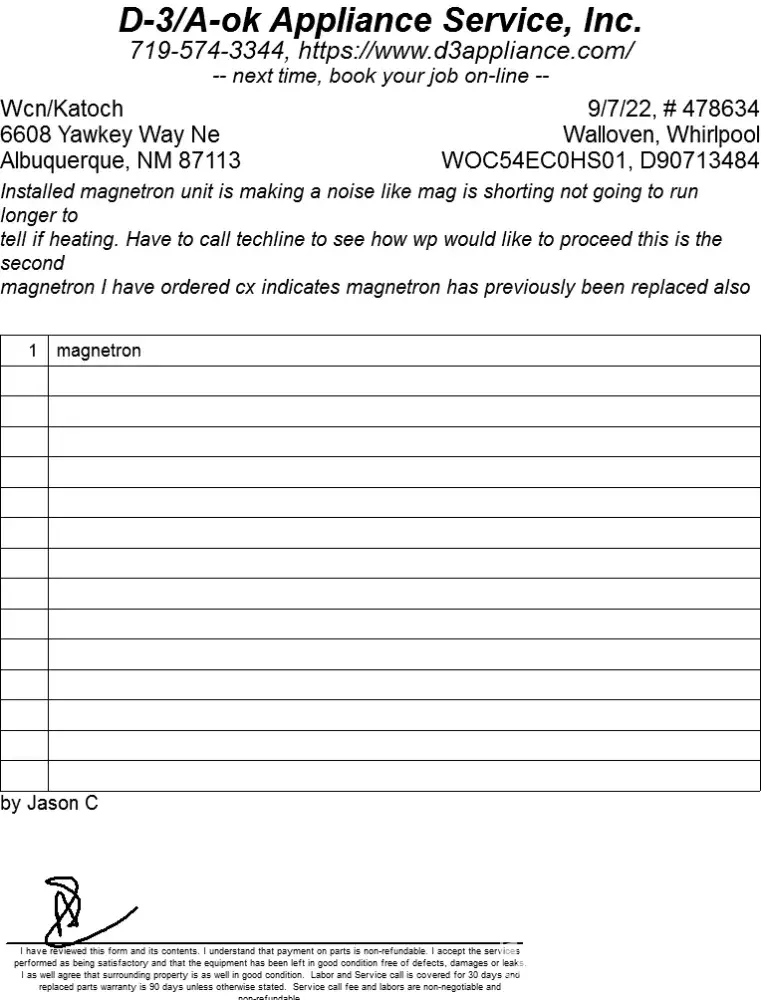 I bought a microwave oven ( a combo) along with a new build home in Feb 2020. In 2021, the microwave went bad and was repaired. Now on 4/4/22 again microwaved spoiled and today was the second unsuccessful attempt from the company to repair. Pls refer to the attached report from the technician. I spoke with the technician and he said he did what he could and didn't know what else to do (replaced the board and magnetron).