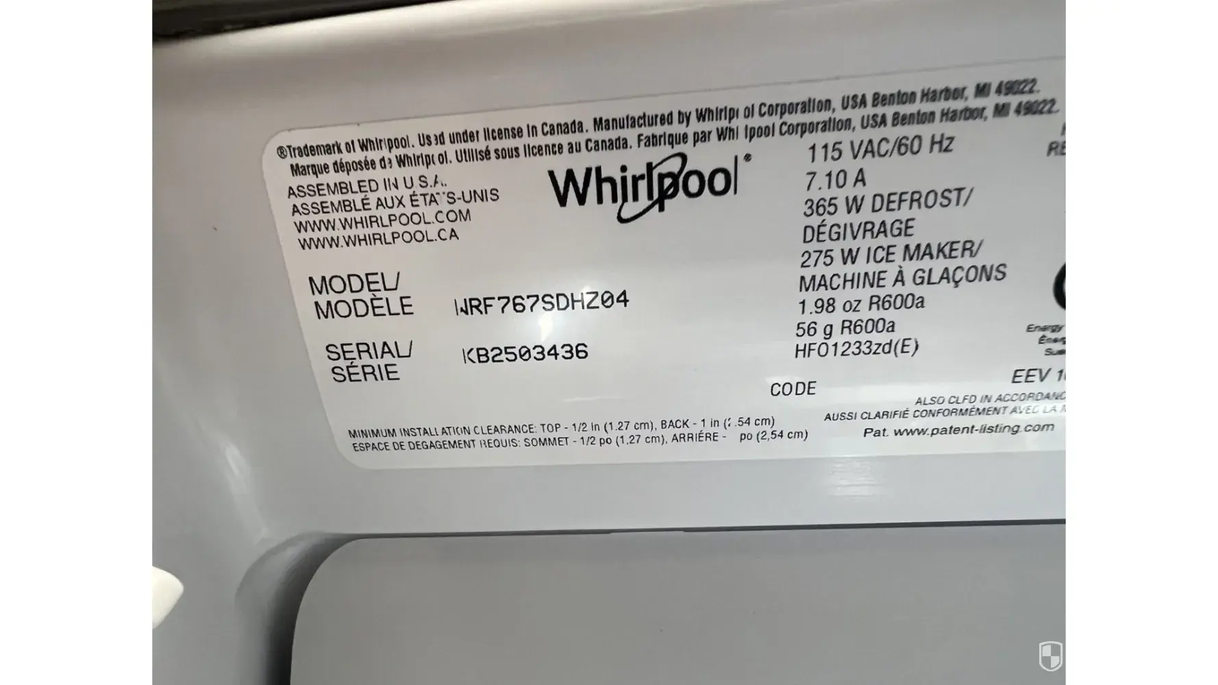 Whirlpool refrigerator - model wrs315snhm - serial # hrb1798522