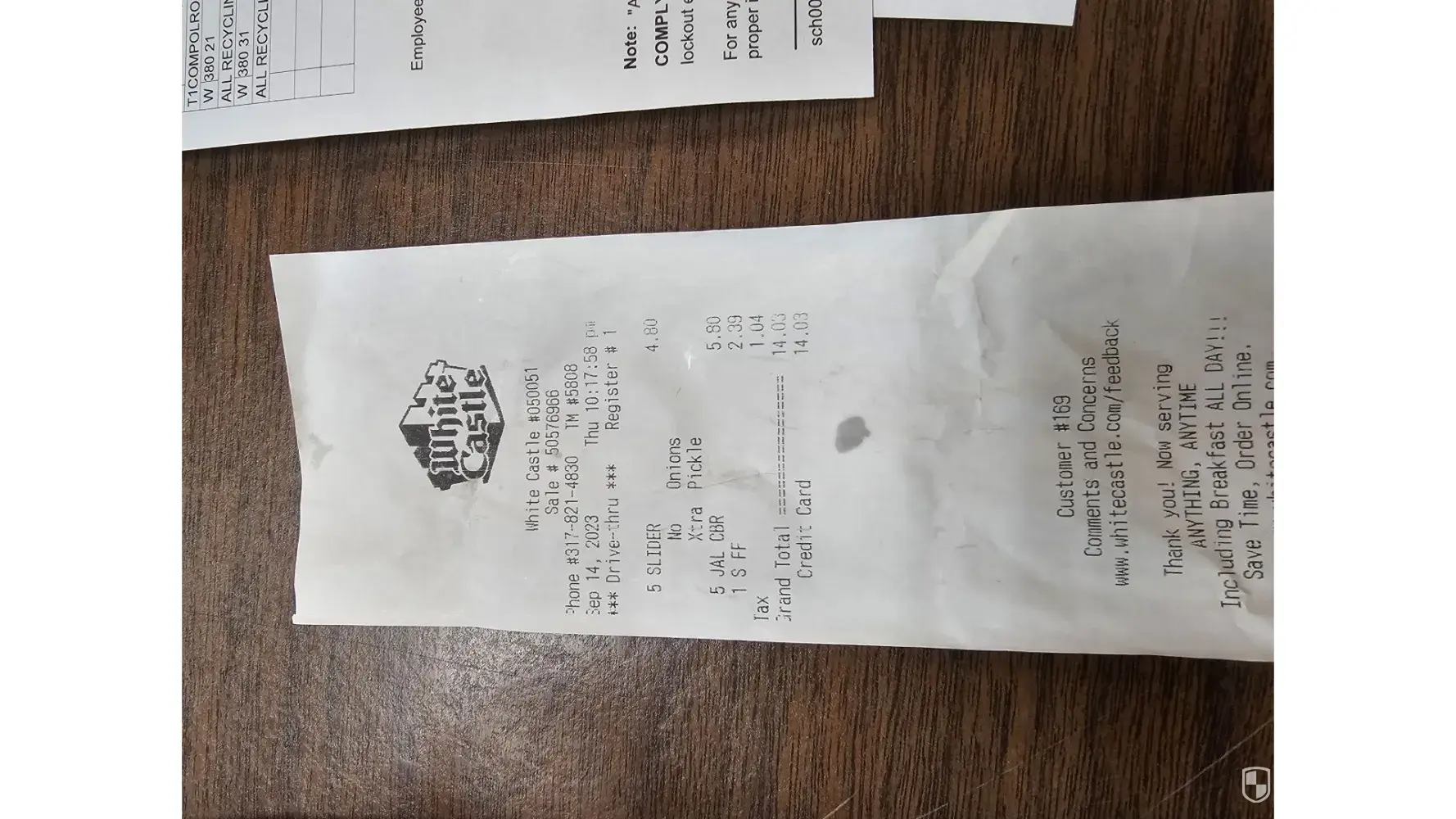 Stoped at my local White Castle the other day for breakfast. Made my order in drive in. Got to window for my order and got ready to pay. While reaching in my money clip I ripped my ten dollar bill in half. The young man at the window refused to take the ripped bill. Told me to get another bill or credit card. I didn’t have any credit card with me and only had a hundred dollar bill besides my ten. He refused to give me my order or take the ten. I told him I had both halves of ten and all he had to do was tape them together. Re still refused my order. I had to just give up and drive off. Not only did he waste the food, but I didn’t get my breakfast. The very next restaurant I stopped took my ten dollar bill in both halves and gave me my breakfast no problem. What a big deal he made of a ripped bill and waste the food at same time