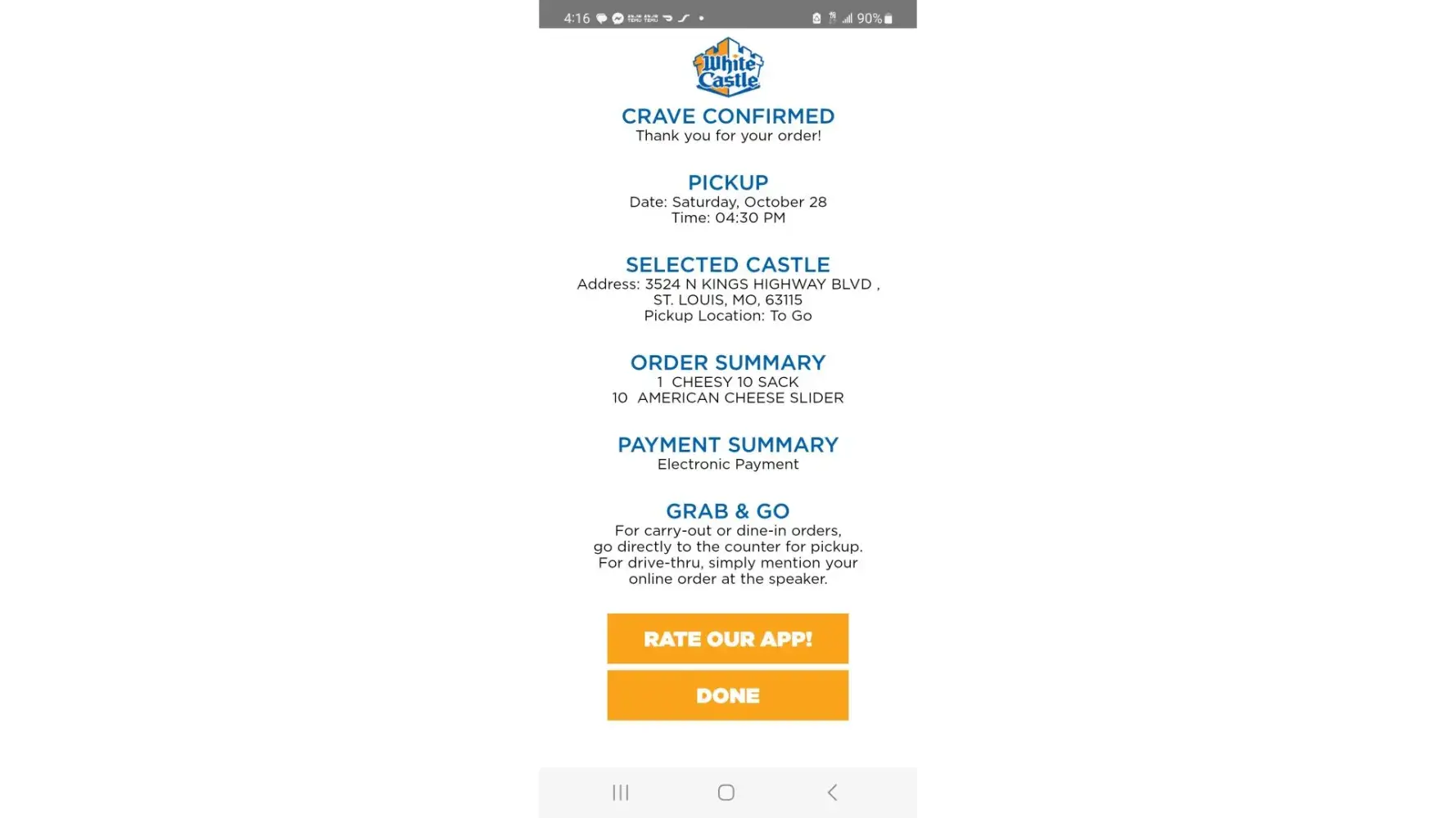 Desired outcome: To be able to go to this, the closest WhiteCastle to my home and and receive the usual WhiteCastle fast service and great tasting food with that great WhiteCastle flavor as always.