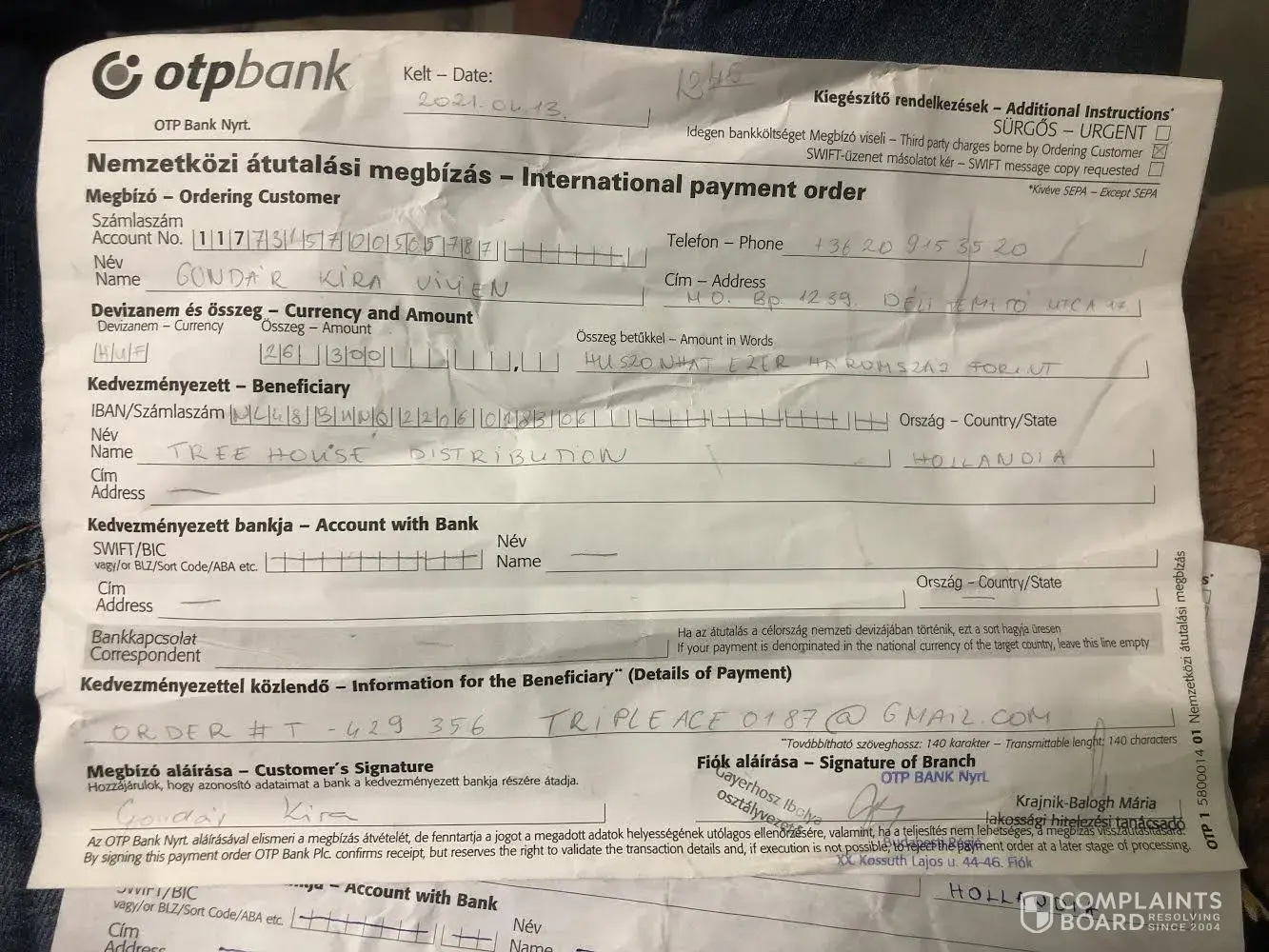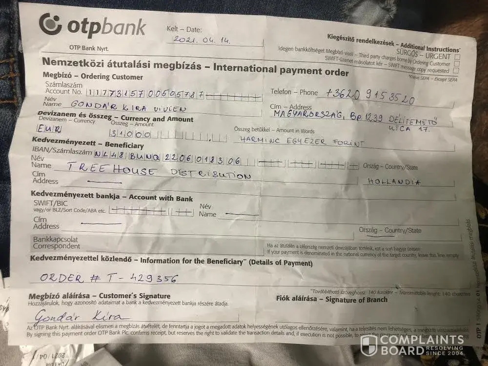 Then I placed a second order T392071 of a higher value, I paid the exact same way (Bank transfer), and I never received anything! They just took my money and vanished!