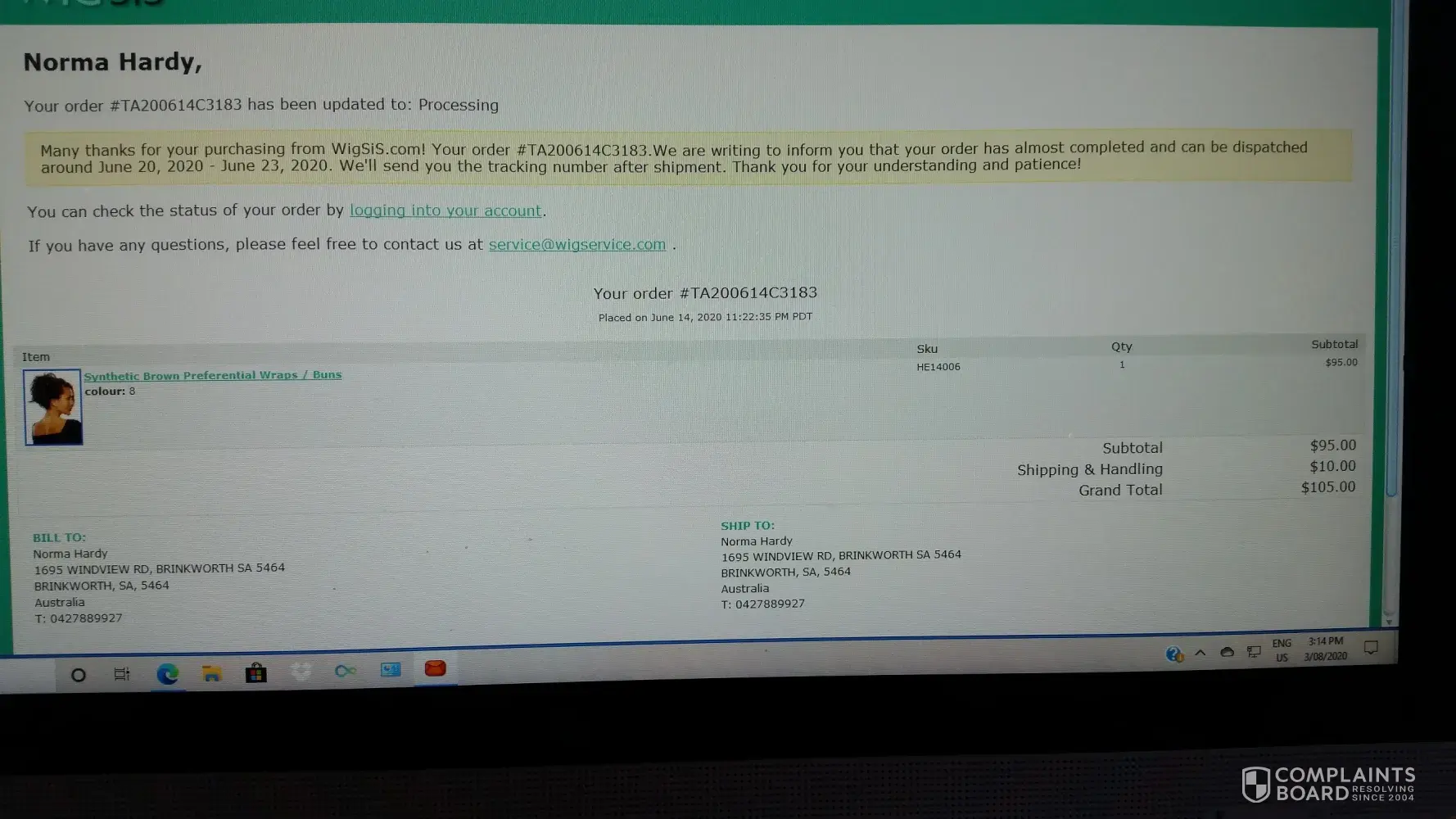 I ordered the wig on August 3rd and received it August 29th. It was awful, looked nothing like the picture and I paid $89 plus shipping and handling for a total of $100. I filled out the form requesting return, so they insisted that I take a picture of the wig . I took the picture, uploaded it on their form on August 30th. I have heard nothing even after three emails requesting a mailing address. I still have heard nothing. I do believe I have been scammed. I plan on writing a complaint to Site Jabber and Federal Trade Commission and Better Business Bureau.